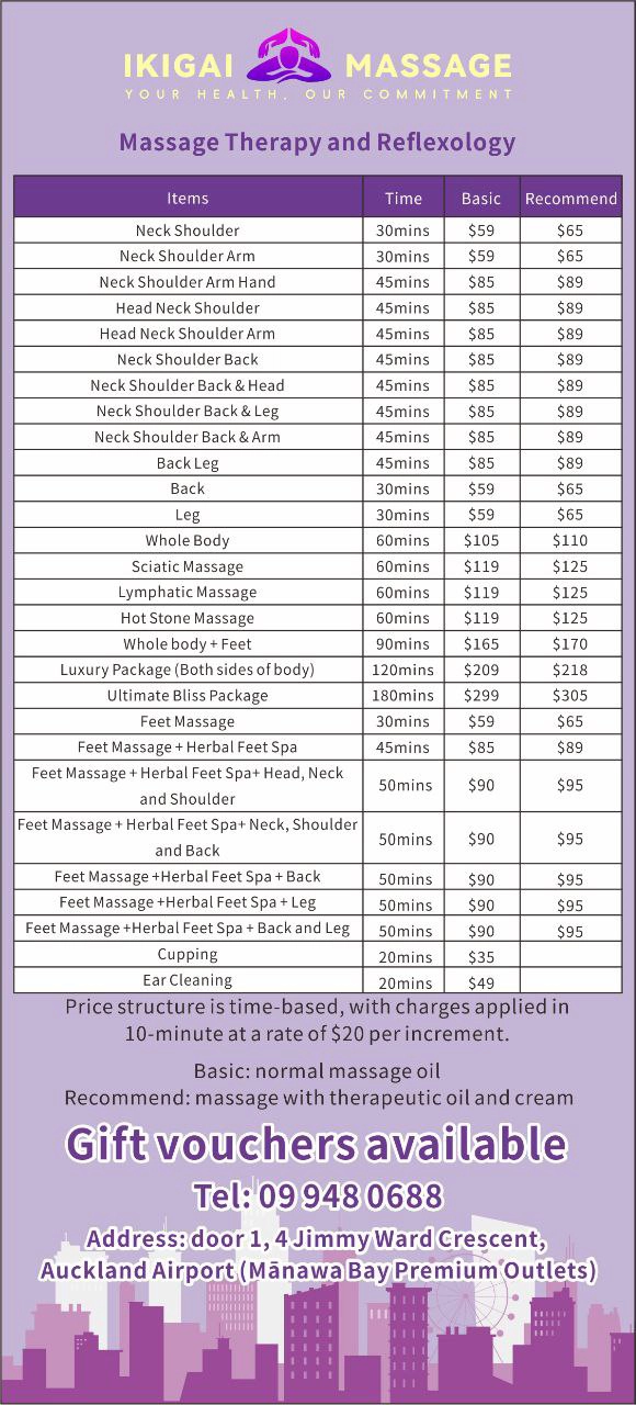 Located at the Mānawa Bay Premium Outlet near Auckland Airport, we provide a sanctuary where your health is our commitment. Ikigai Massage invites you to discover the art of balance and renewal.